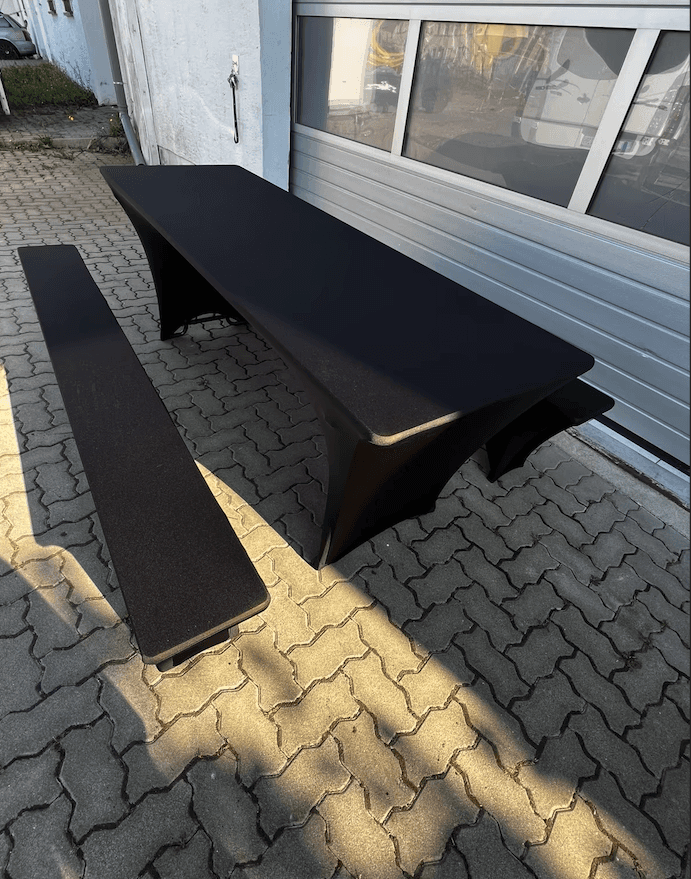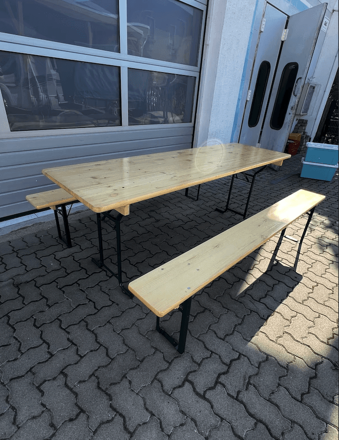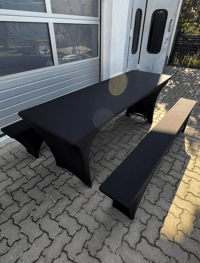 Unsere Bierbankgarnituren bestehen aus einem Tisch in breiter Ausführung (2,20 m × 0,70 m) mit stabiler Holzplatte sowie zwei passenden Bänken (2,20 m × 0,25 m), die durch ihre robuste und komfortable Bauweise überzeugen. Dazu bieten wir auf Wunsch elegante Hussen in Anthrazit, passend für Tisch und Bänke. Diese sind pflegeleicht und werden nach der Veranstaltung von uns gereinigt, sodass Sie sich um nichts kümmern müssen.